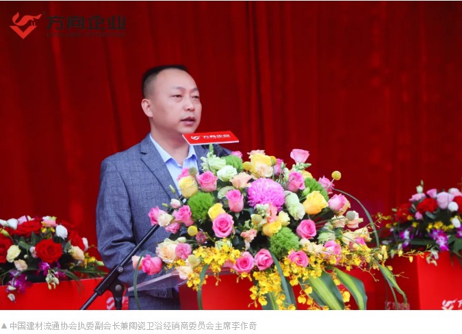 中国建材流通协会执委副会长兼陶瓷卫浴经销商委员会主席李作奇为本次落成庆典送上了真挚的祝福,并对公司未来的发展寄予厚望,他表示党十九大报告提出实施乡村振兴战略,这与方向企业细分渠道布局相迎合,是发展乘势而上的一大机遇。希望方向企业能修炼好内功,持续创新发展,强化市场布局,为行业和消费者做出更大的贡献。