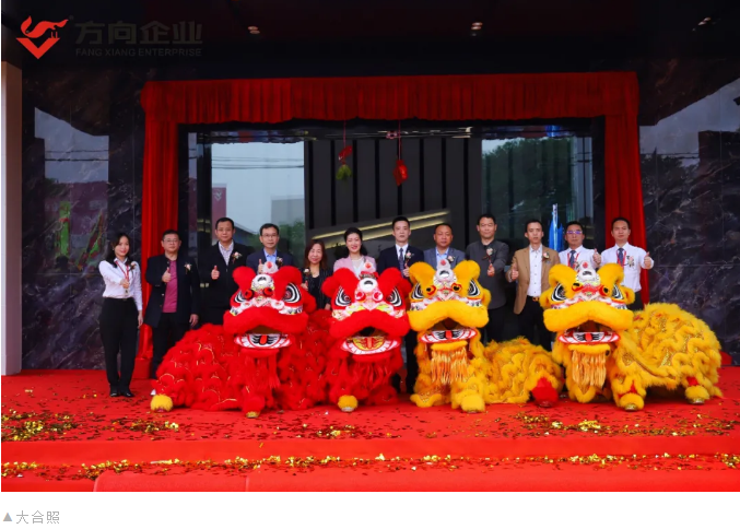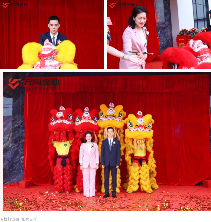 醒狮点睛降祥瑞,锣鼓齐鸣庆欢腾。各位贵宾共同为庆典剪彩,开启方向发展新里程。随后,方向企业董事长梁维铭与董事总经理刘丽燕共同为祥狮点睛,随着祥狮觉醒、起舞、采青吐福,将本次庆典推向了高潮。