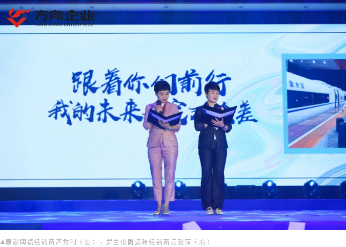 12年商海磨砺,始得势能;12年真诚以待,方得始终。康骏陶瓷经销商严秀利、罗兰伯爵瓷砖经销商汪爱萍共同合作的诗朗诵《我和方向》深情款款地道出了对方向企业的热爱和感恩,让全体方向人为之动容。
