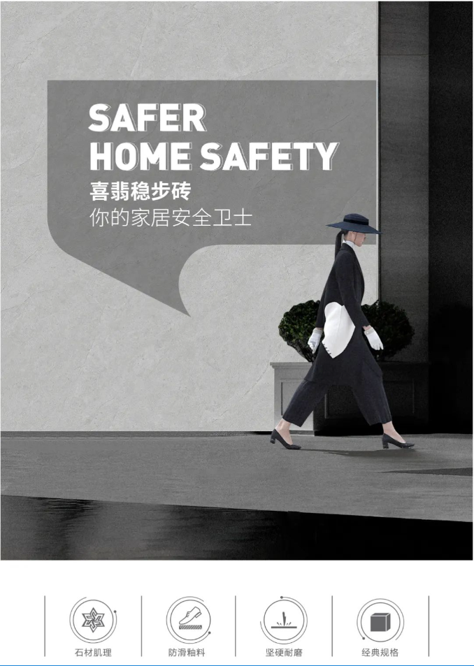 喜翡稳步砖在坯、釉、蜡水中均作创新处理,搭配复合创新技术,实用性能大幅提升,多维护守护家居安全。