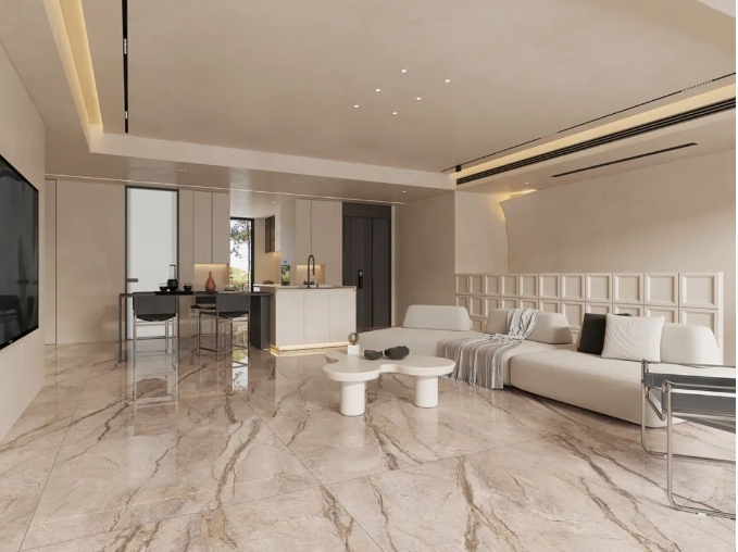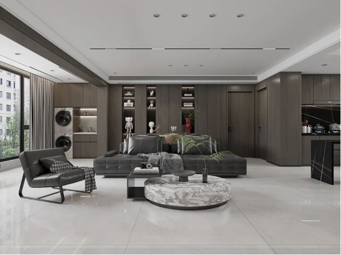 1200x1200mm具有更大的空间延展性,不仅能突破传统规格瓷砖所带来的审美疲劳,更能提升家居空间的质感与调性。与此同时,在铺贴应用上,用砖量更少,相比其他尺寸更便于切割加工。